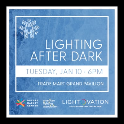 Lighting After Dark, Tuesday, 6pm, TM 1 Grand Pavilion - Lighting After dark will be kicking off January 2023 Lightovation on Tuesday January 10th at 6PM. This popular lighting industry party is now an on-site event at the Trade Mart Grand Pavilion. Dallas Market Center, Lightovation exhibitors, and the American Lighting Association present Live Music, Dinner, and Drinks.